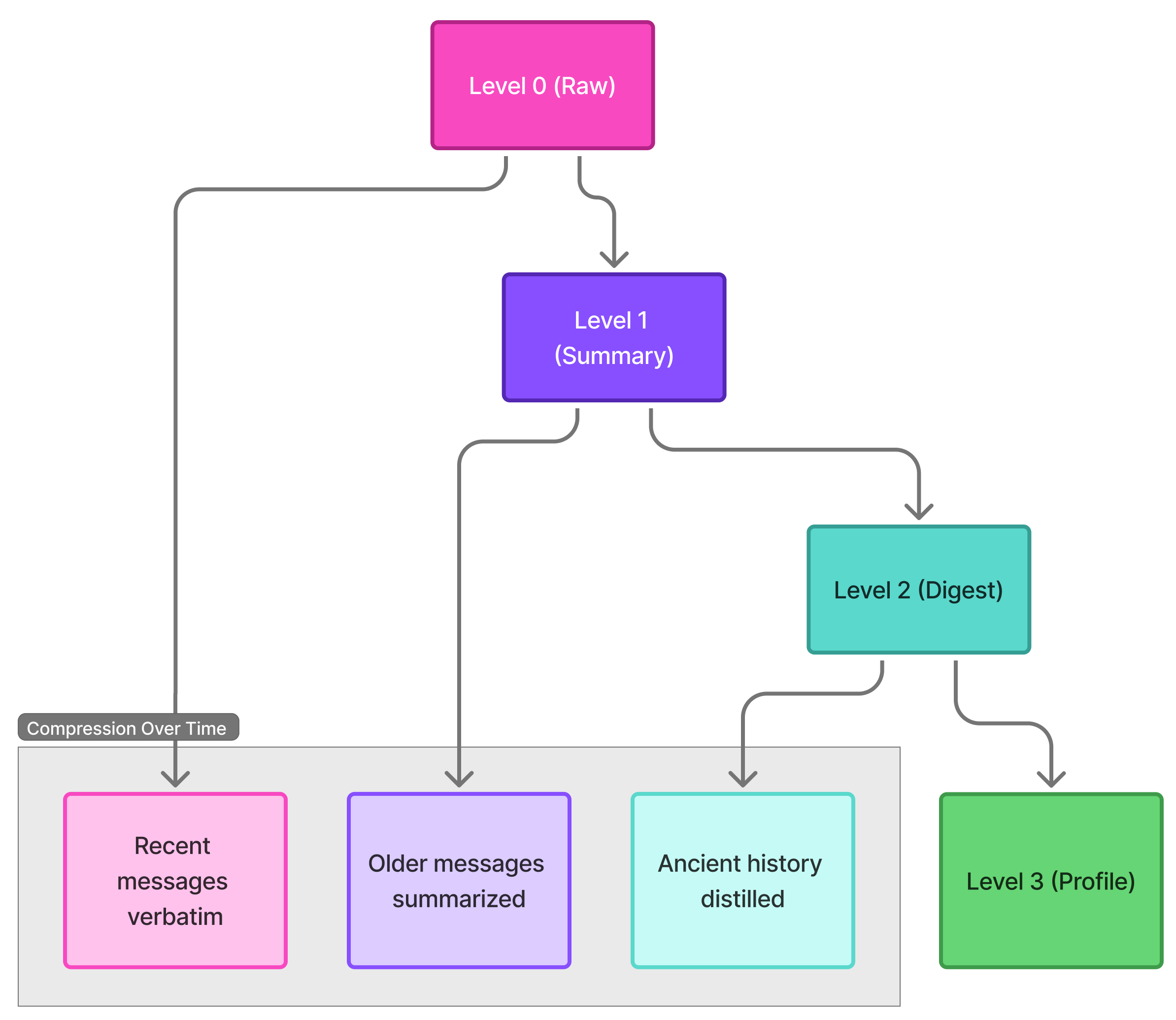 Level 0 (Raw): Complete conversation history (recent only)Level 1 (Summary): Summarized older conversationsLevel 2 (Digest): High-level summary of session themesLevel 3 (Profile): Long-term user/context profile