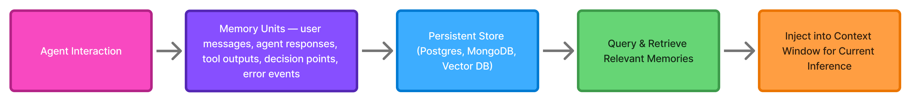 Long-Term Memory (Persistent Storage): Facts, patterns, and experiences that should persist indefinitely. Customer preferences, learned patterns, historical decisions. This lives in external storage—databases, vector stores, or knowledge graphs.