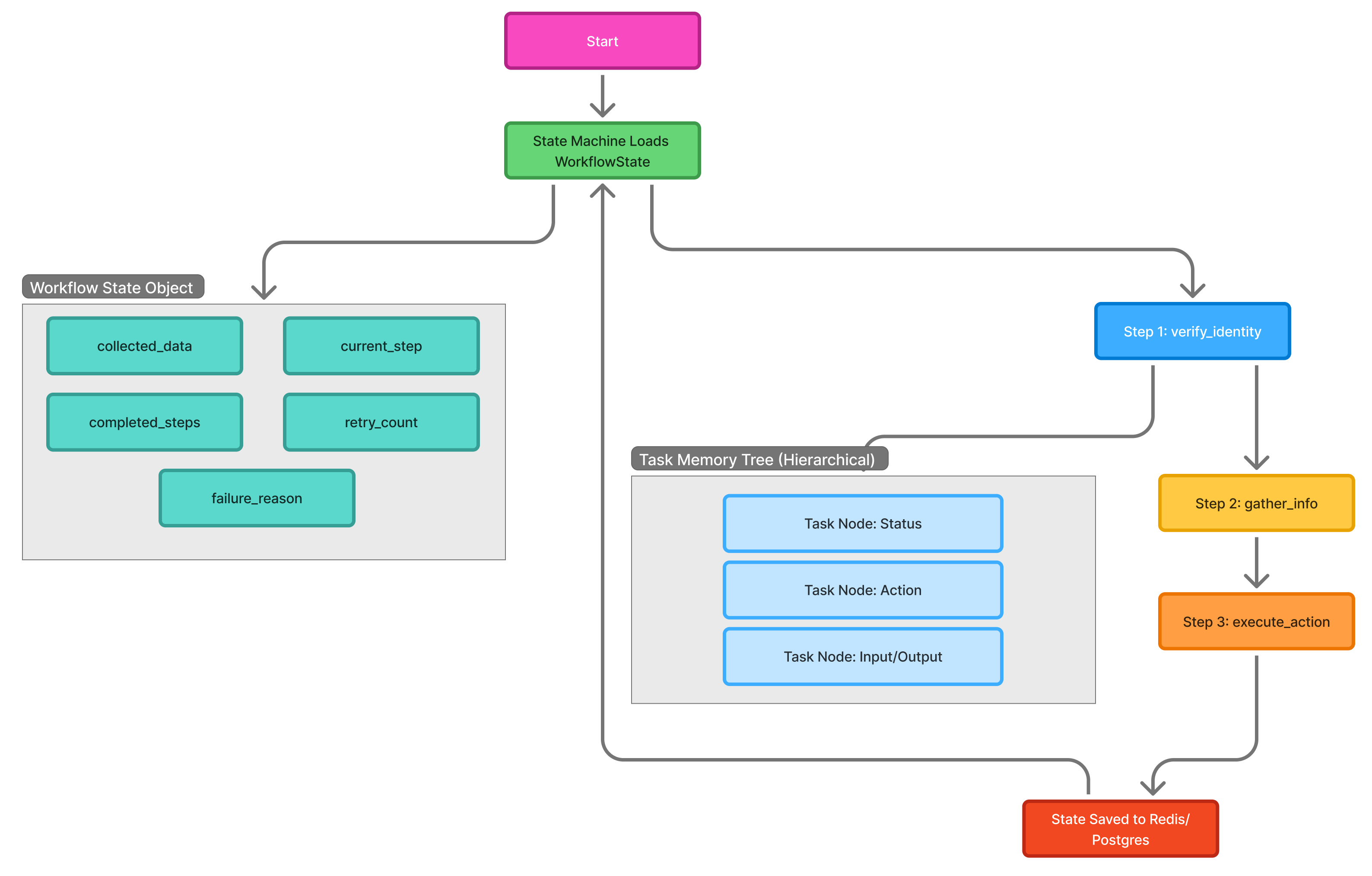 class WorkflowState: current_step: str # "verify_identity" | "gather_info" | "execute_action" completed_steps: List[str] collected_data: Dict[str, Any] retry_count: int failure_reason: Optional[str]