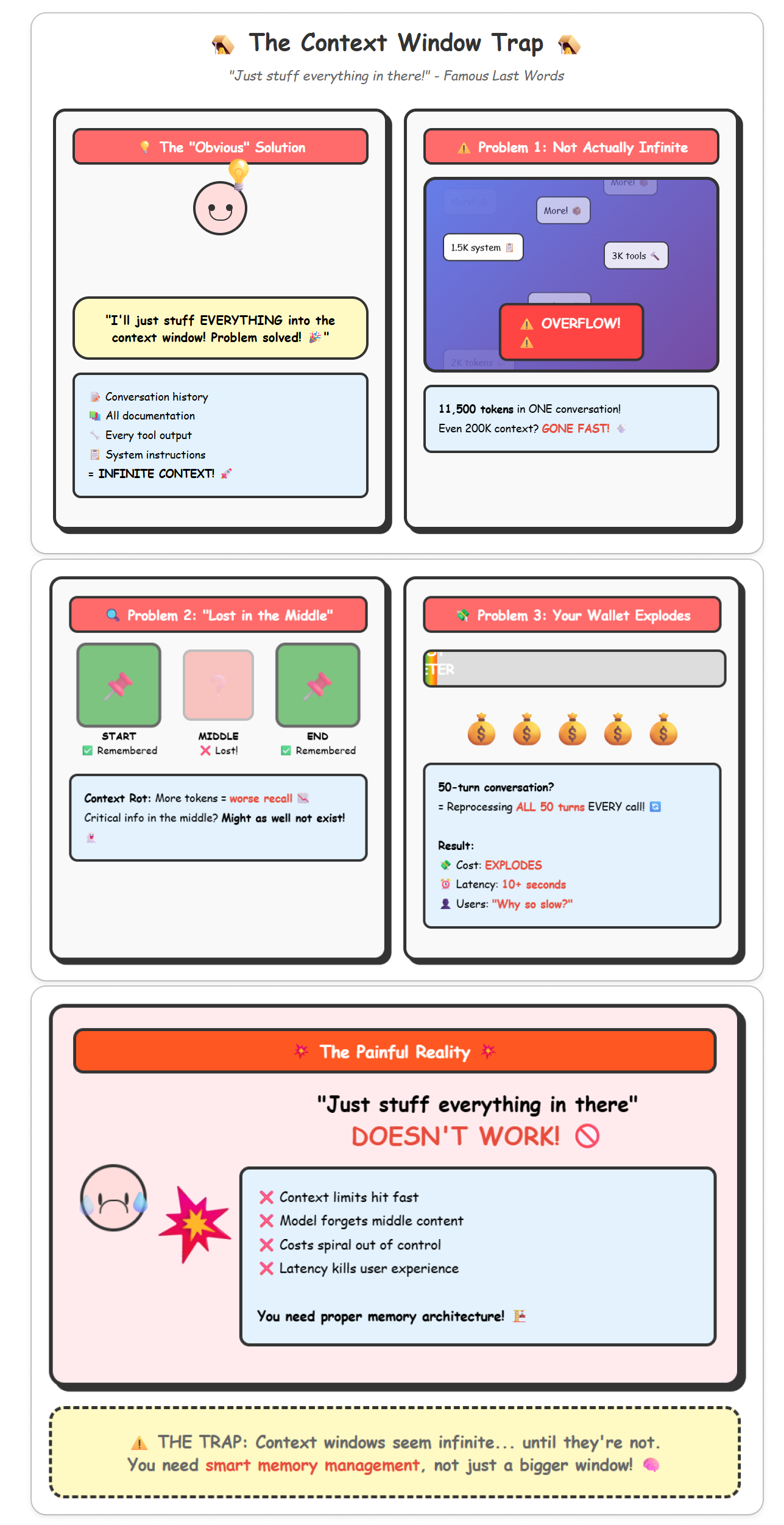 The obvious solution is to just stuff everything into the context window, right? Keep the entire conversation history, every tool output, all the relevant documents. Problem solved.
