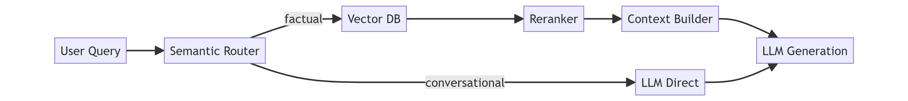 graph LR A[User Query] --> B[Semantic Router] B -->|factual| C[Vector DB] B -->|conversational| D[LLM Direct] C --> E[Reranker] E --> F[Context Builder] F --> G[LLM Generation] D --> G