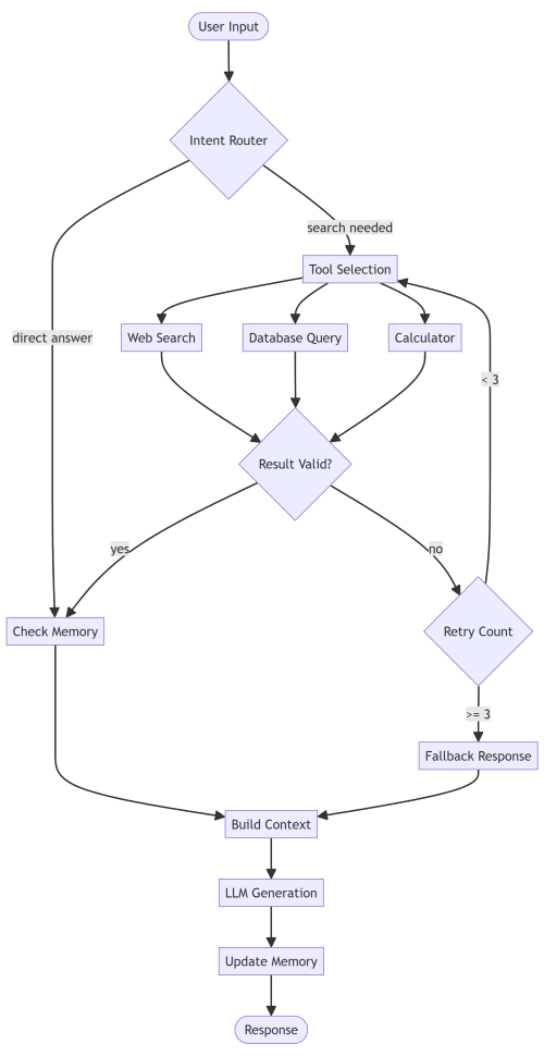 flowchart TD Start([User Input]) --> Router{Intent Router} Router -->|search needed| ToolSelect[Tool Selection] Router -->|direct answer| Memory[Check Memory] ToolSelect --> Search[Web Search] ToolSelect --> DB[Database Query] ToolSelect --> Calc[Calculator] Search --> Validate{Result Valid?} DB --> Validate Calc --> Validate Validate -->|yes| Memory Validate -->|no| Retry{Retry Count} Retry -->|< 3| ToolSelect Retry -->|>= 3| Fallback[Fallback Response] Memory --> Context[Build Context] Fallback --> Context Context --> LLM[LLM Generation] LLM --> Update[Update Memory] Update --> End([Response])