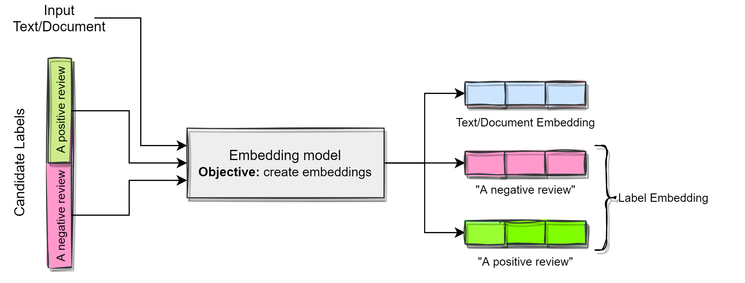We can use zero-shot classification using embeddings. We can describe our labels based on what they should represent. The following diagram describes the concept.