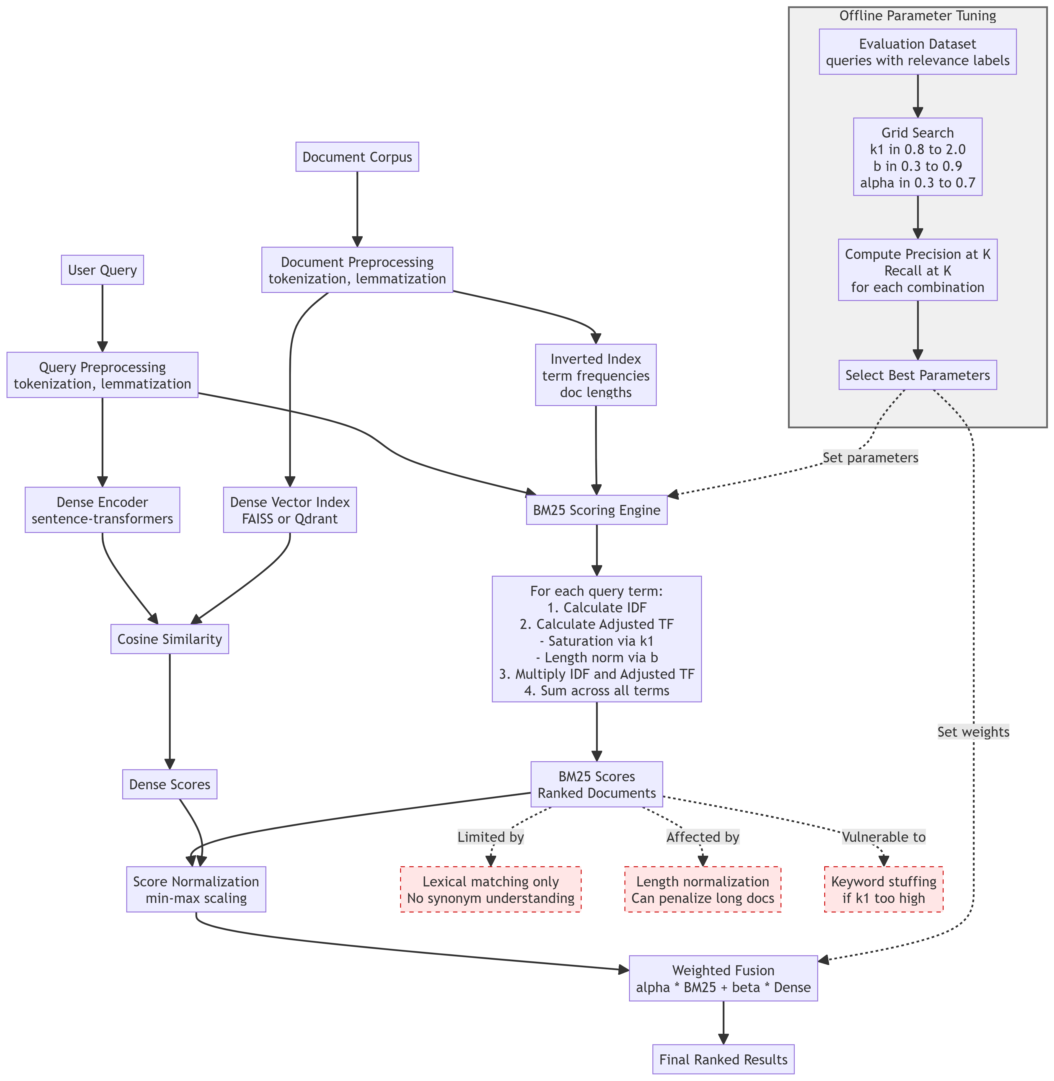 The key isn't just implementing BM25. It's understanding when k1 and b matter, how to tune them with actual evaluation, and when to combine it with dense retrieval for better coverage.