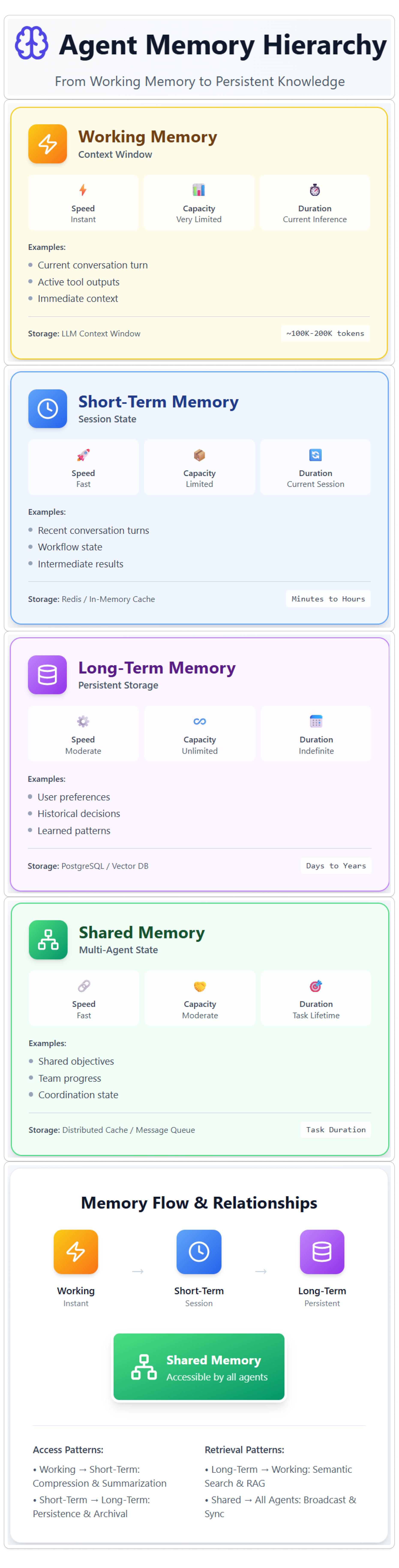 Long-Term Memory (Persistent Storage): Facts, patterns, and experiences that should persist indefinitely. Customer preferences, learned patterns, historical decisions. This lives in external storage—databases, vector stores, or knowledge graphs.