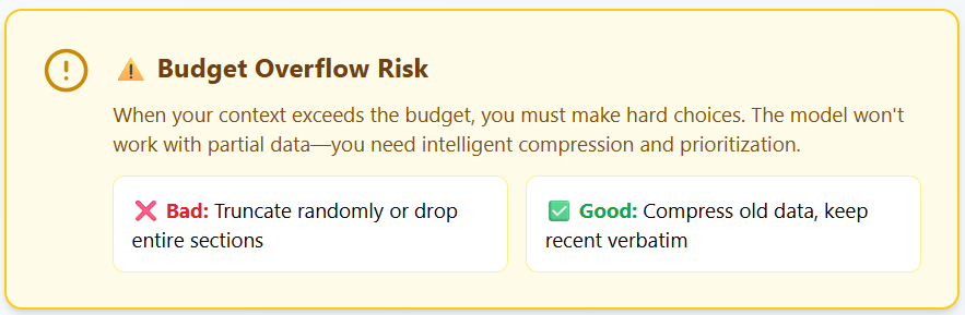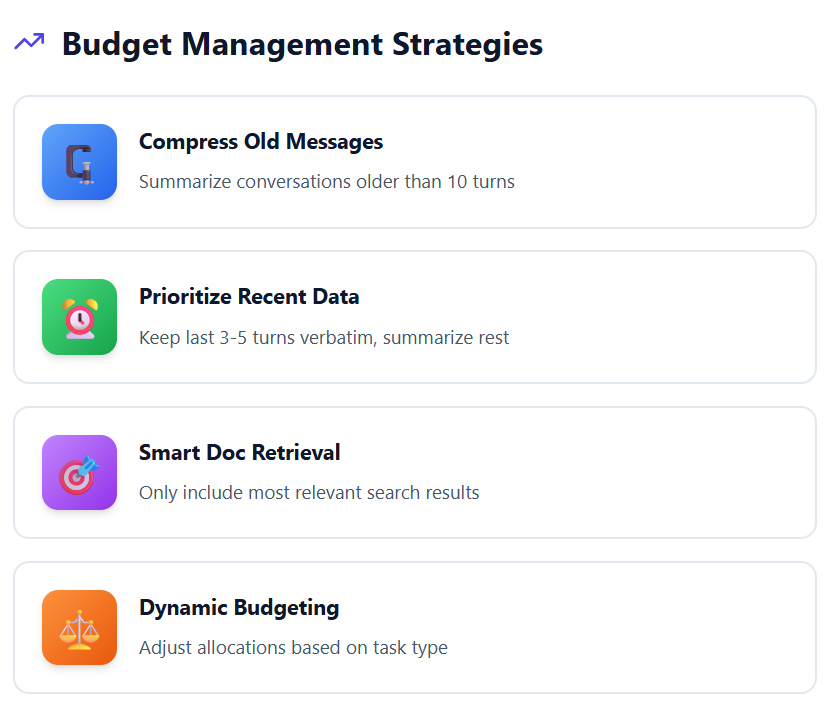 def handle_context_overflow(messages, context_limit): if token_count(messages) > context_limit: # Option 1: Compress oldest messages compressed = compress_messages(messages[:-10]) recent = messages[-10:] return compressed + recent # Option 2: Selectively drop low-importance items prioritized = rank_by_importance(messages) return prioritized[:max_messages]