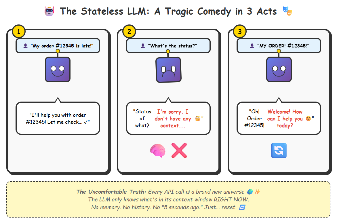 Let's start with the uncomfortable truth: LLMs are completely stateless. Every API call is a brand new universe. The model doesn't remember the last conversation, the previous decision, or anything that happened five seconds ago. It only knows what's in its context window right now.