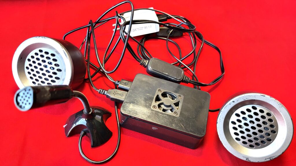 The following picture describes my setup which consists of a Raspberry Pi to host the LLM (llama3.2:1b), a mic for asking questions, and a pair of speakers to play the answers from the bot. I have used the Internet while doing the installation etc. but the bot works in offline mode.
