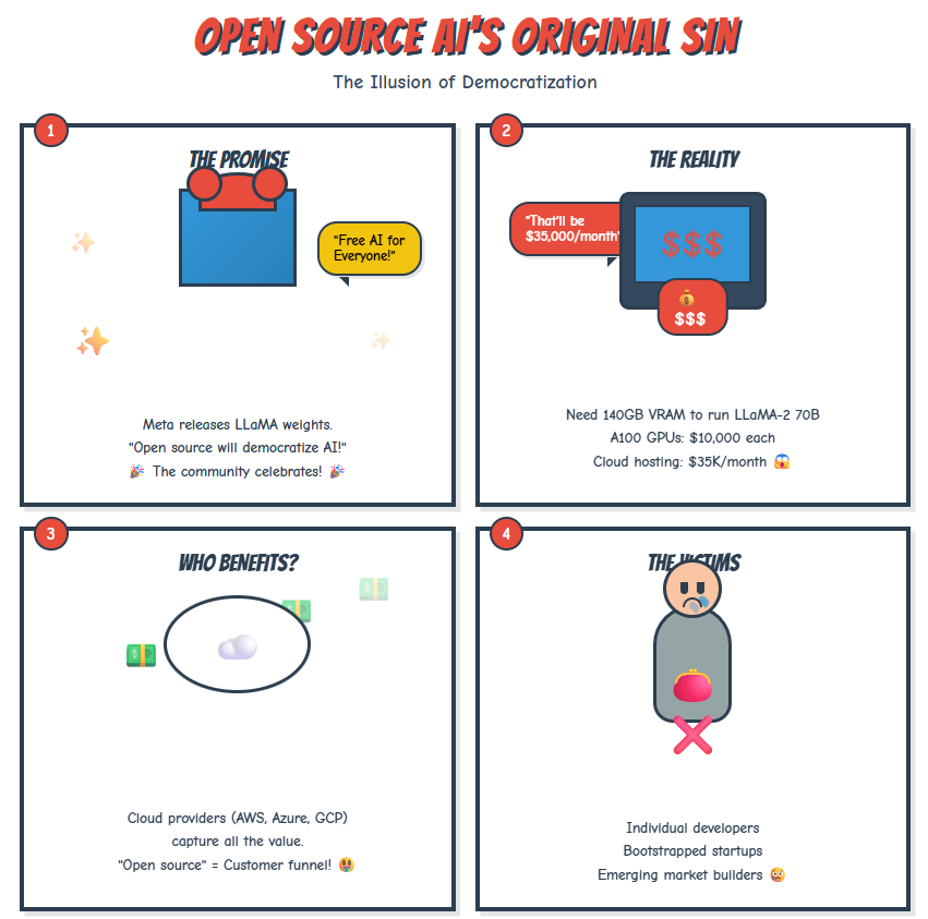 The original sin isn't releasing open models—that's genuinely valuable. The sin is calling it democratization while ignoring the economic barriers that matter more than technical ones. We're building cathedrals and wondering why only the wealthy enter, forgetting that doors without ramps aren't really open.