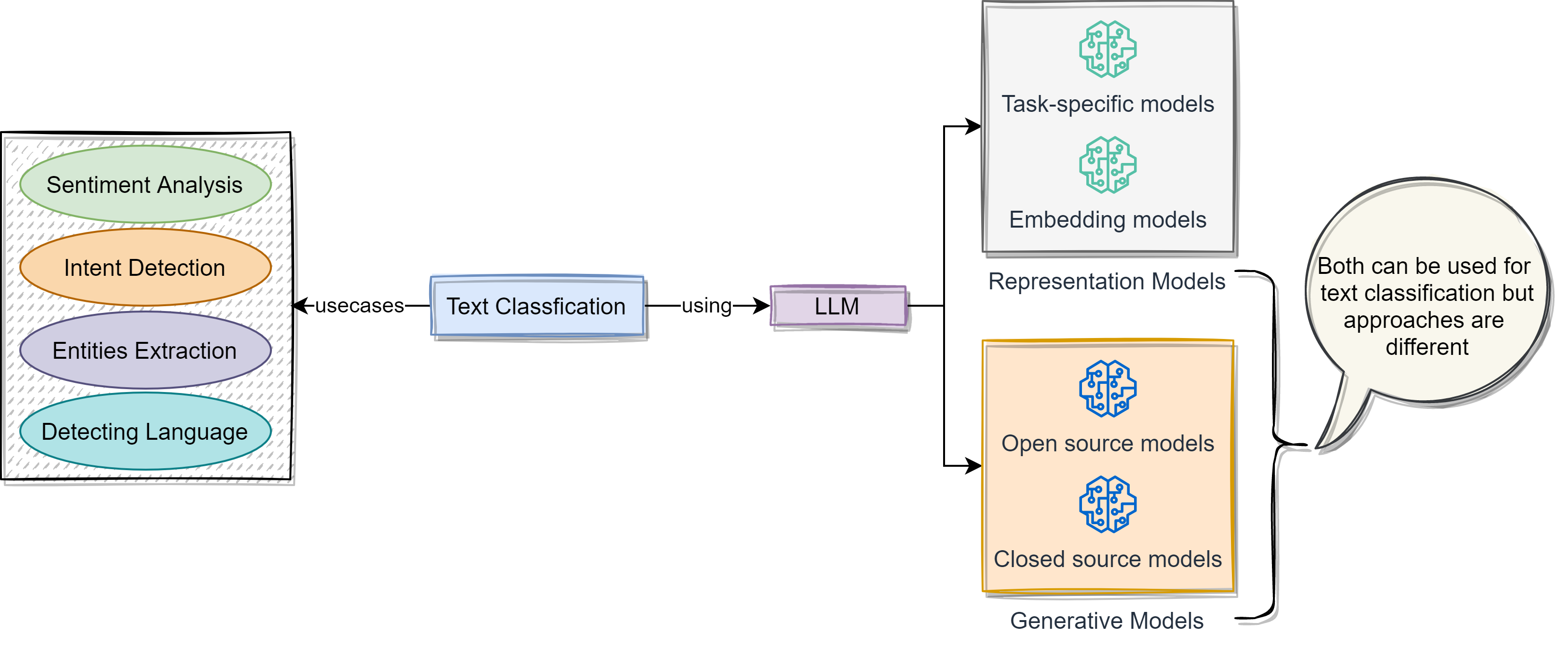 A common task in natural language processing (NLP) is text classification. Use cases of text classification include sentiment analysis, intent detection, entity extraction, and language detection. This article will delve into how to use LLMs for text classification. We will see representation models and generative models. Under the representation model, we will see how to use task-specific models and embedding models to classify the text. Under the generative models, we will see open source and closed source models. While both generative and representation models can be applied to classification, they take different approaches.