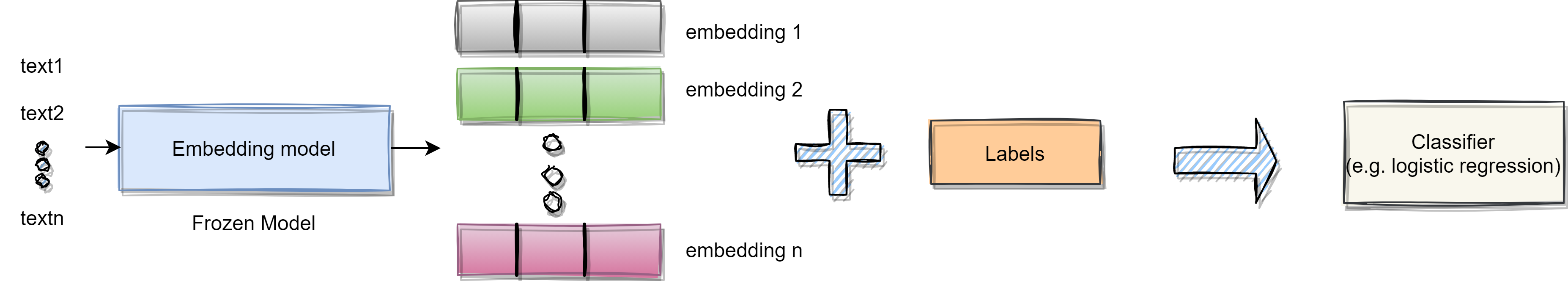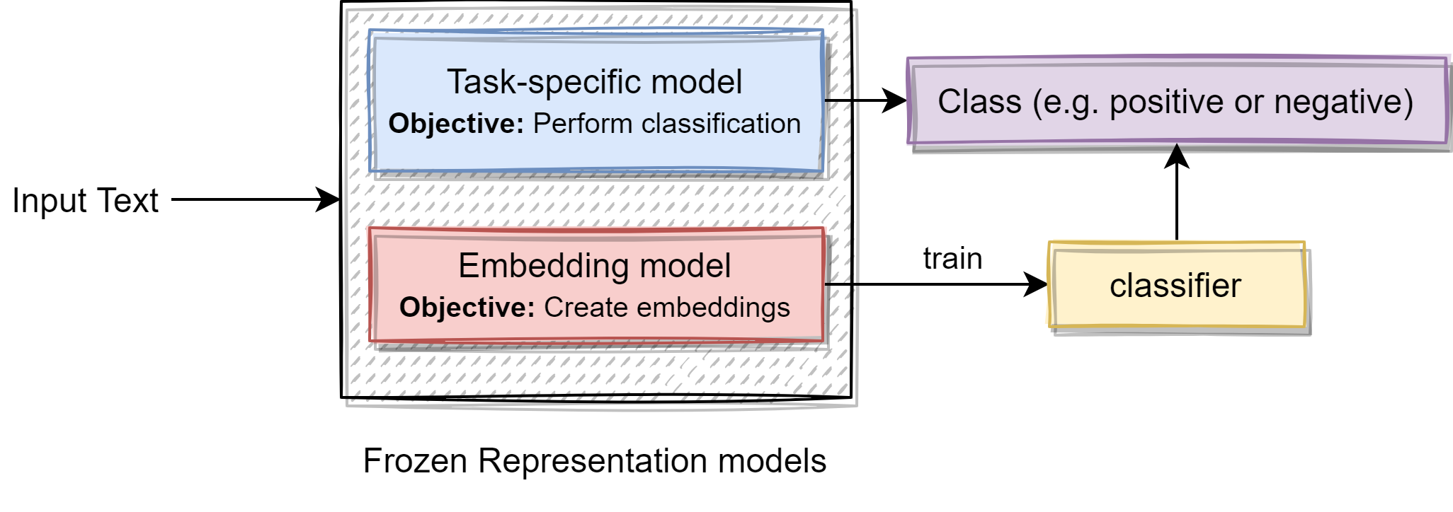 As it can be seen in the below diagram, when used in the text classification use case, representation models are kept frozen (untrainable). As the task-specific models are specially trained for the given task, when the text is given as input, it can classify the given text as per the task at hand. But when we are using the embedding model, we need to generate embeddings for the texts in the training set. Then train a classifier on the train dataset that has embeddings and corresponding labels. Once the classifier is trained, it can be used for classification.