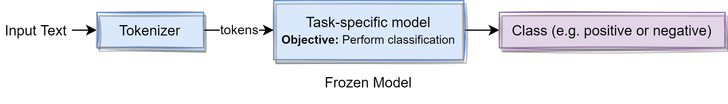 This is pretty straight forward. Text is passed to the tokenizer that splits the text into tokens. These tokens are consumed by the task-specific model for predicting the class of the text.
