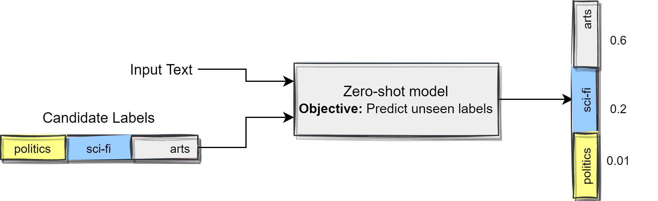 We have the definition of the labels, but we do not have the labeled data, we can utilize what is called "zero-shot classification". Zero-shot model predicts the labels of input text even if it was not trained on them. Following diagram depicts the concept.