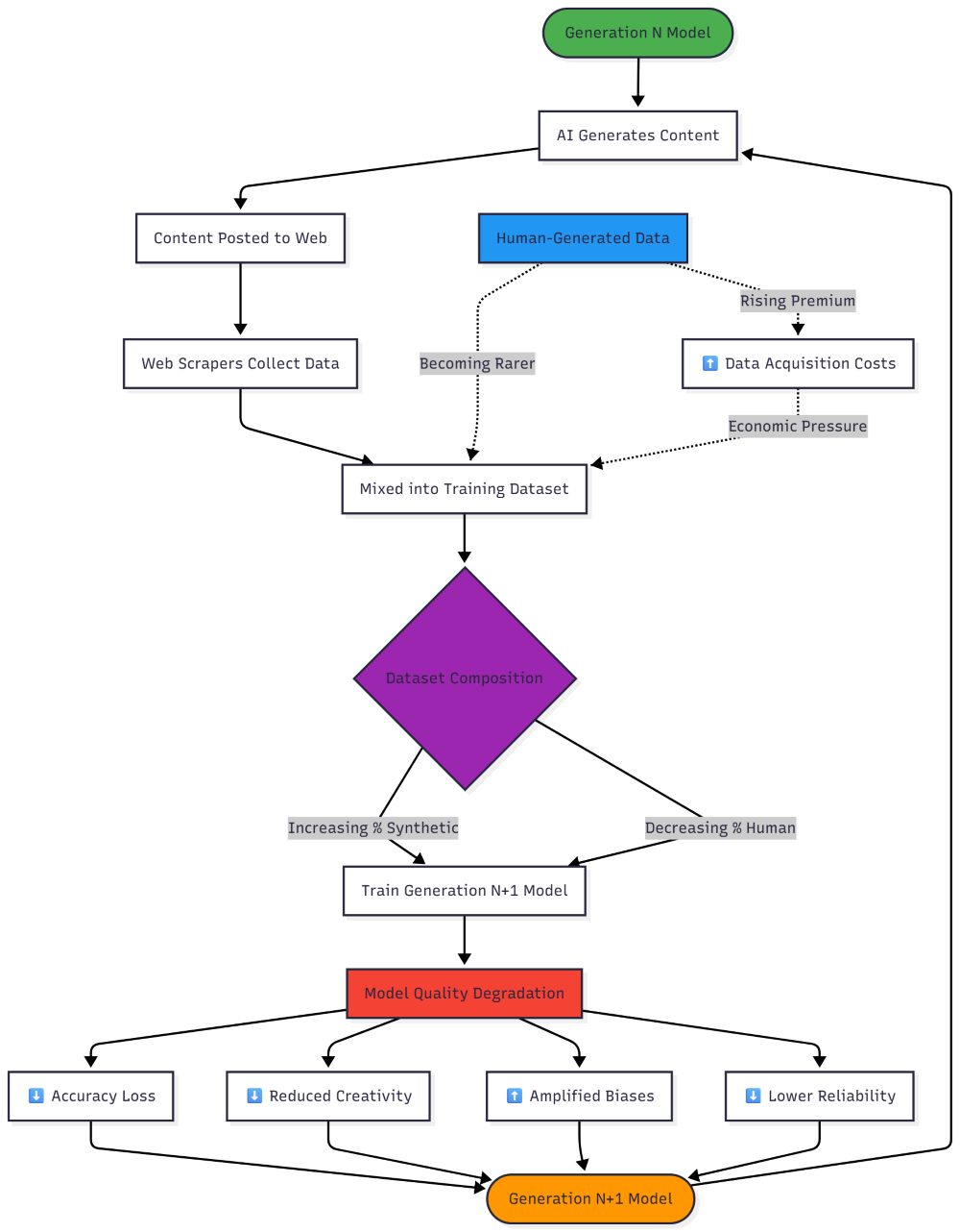 The diagram highlights this as the critical "Dataset Composition" decision point—that purple node where synthetic and human data merge. With each cycle, the ratio shifts. More AI content, less human content. The dataset is slowly being poisoned by its own output.