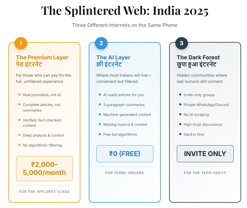 Here's the problem for India: If quality information becomes expensive, only the rich get the full story. Everyone else gets summaries, shortcuts, and AI-filtered versions. This isn't just unfair—it's dangerous for democracy.